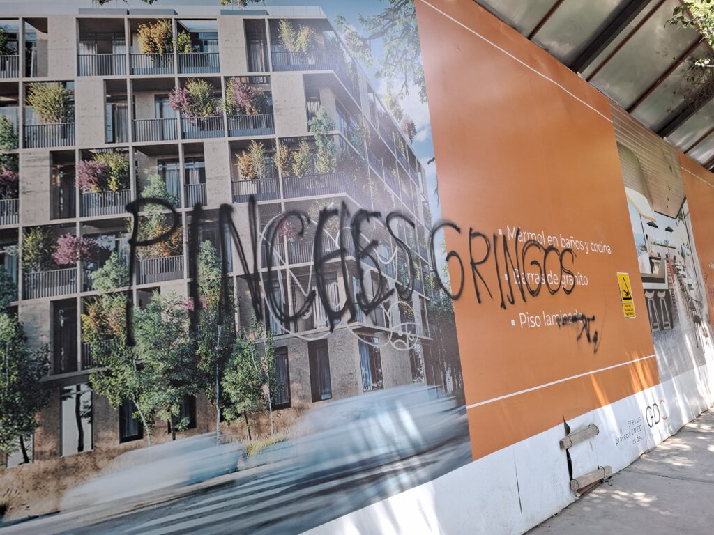 Bild: An die Reklame einer Baufassade eines teuren Neubaus in Mexico City wurde «Pinche Gringo» (Scheiss Gringo) geschrieben.